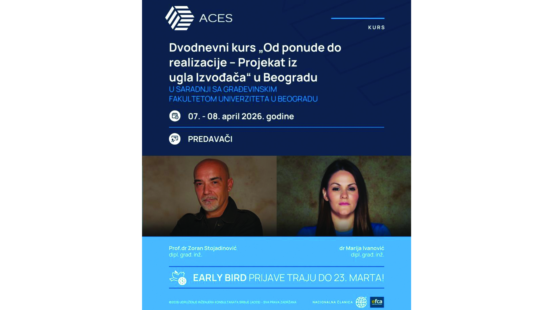 Удружење инжењера консултаната Србије – АЦЕС у сарадњи са Грађевинским факултетом Универзитета у Београду вас позива да се пријавите и резервишете своје место на дводневној обуци: