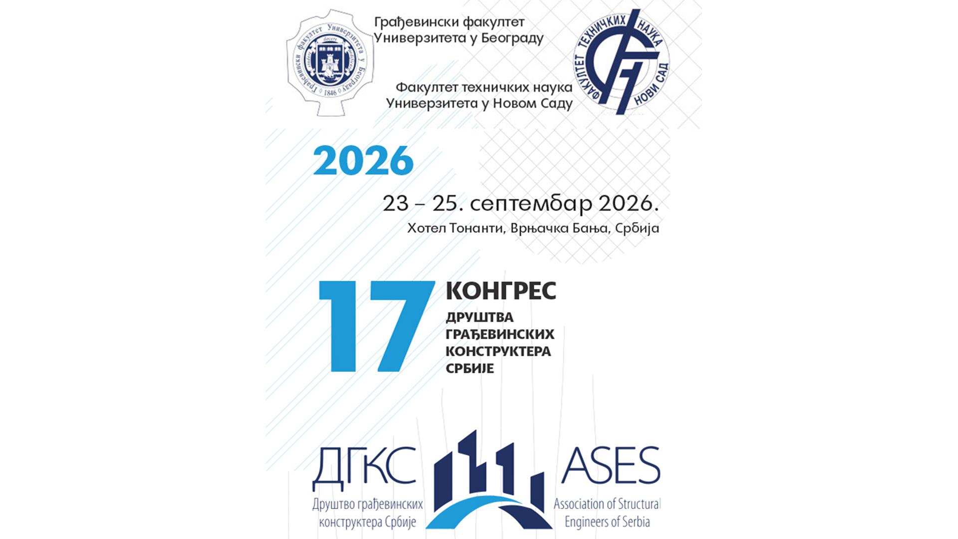 Друштво грађевинских конструктера Србије – ДГКС у сарадњи са Грађевинским факултетом Универзитета у Београду и Факултетом техничких наука Универзитета у Новом Саду, организује Конгрес који ће се одржати од 23. до 25. септембра 2026. године у хотелу “Тонанти” у Врњачкој Бањи.